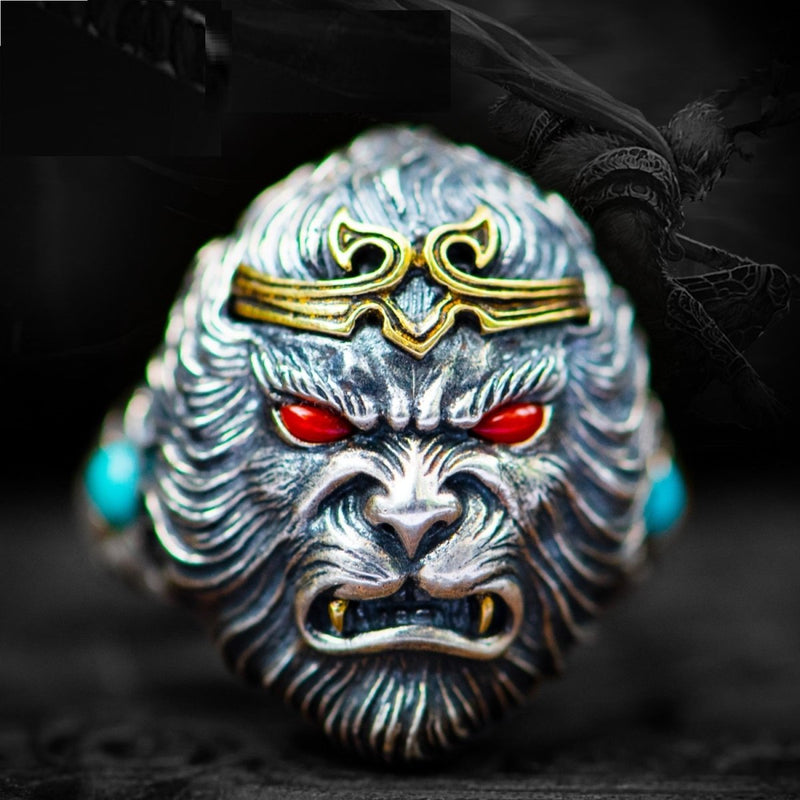 Découvrez la bague du Roi Singe , un chef-d'œuvre de narration et d'artisanat. Inspirée du légendaire Sun Wukong. Inspirée du Voyage en Occident , cette bague présente une tête de singe finement sculptée en argent 925, aux yeux de pierres précieuses rouge flamboyant, rehaussés de turquoise bleue et de motifs dorés. Chaque détail, de la gravure « Ruyi Jingu Bang » à l'intérieur de l'anneau à la texture de la fourrure et à l'expression farouche, donne vie au mythe. Portée comme un bijou affirmé ou un talisman personnel, cette bague incarne le courage, la sagesse et l'esprit rebelle du Roi Singe.