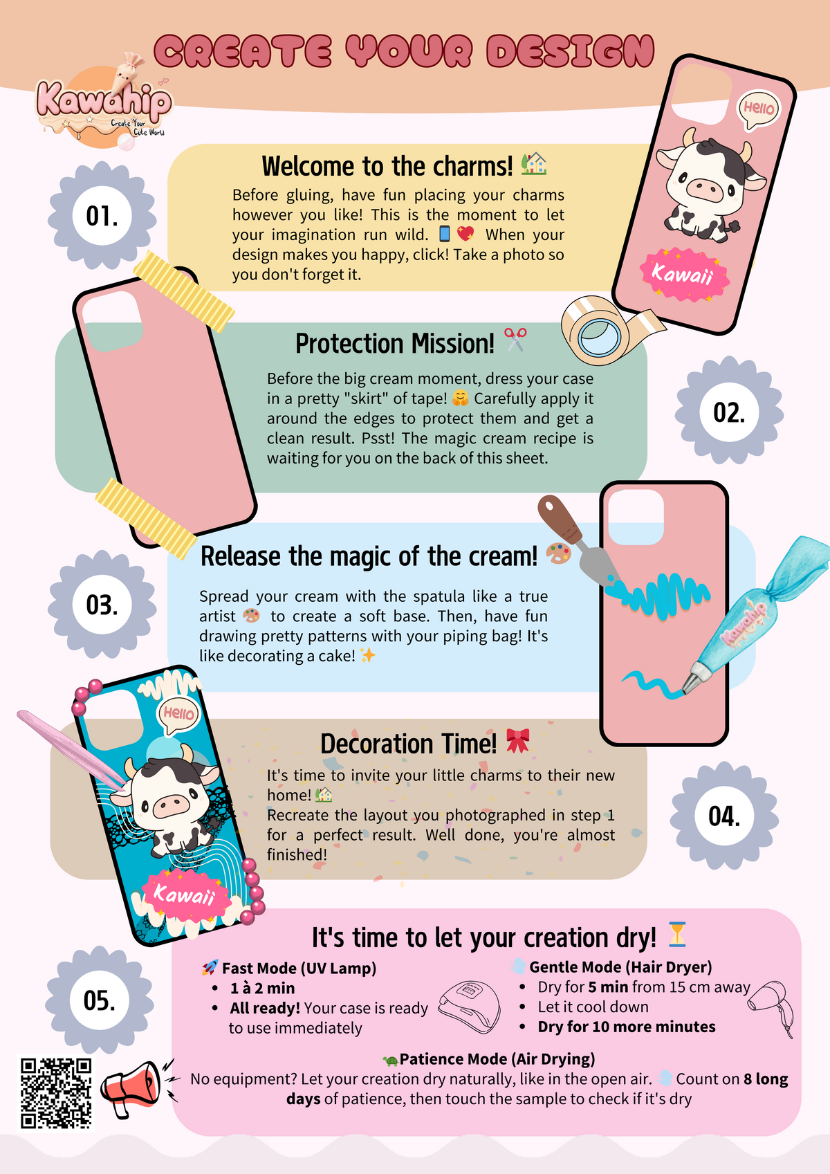 Got your decorating idea and your KAWAHIP cream glue? Great! But before we start, let's take 2 minutes to properly prepare your materials. It's the secret to a successful and stress-free project. Follow the guide! ✨