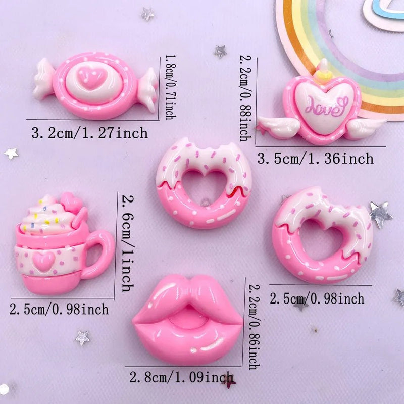 - Contenu : 10 accessoires/figurines en résine 3D (assortiment de cœurs, donuts, nœuds, personnages).