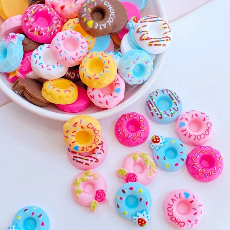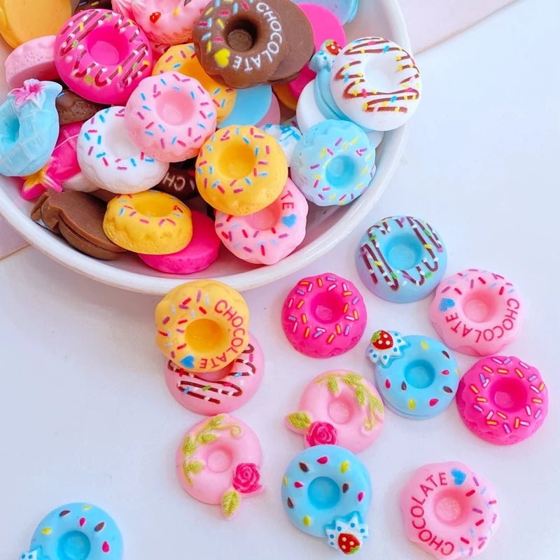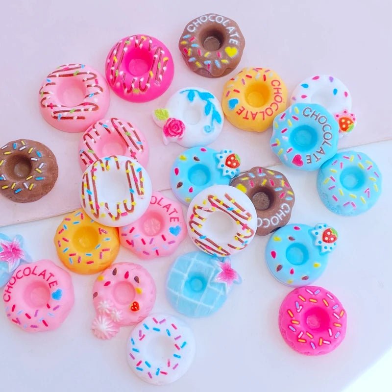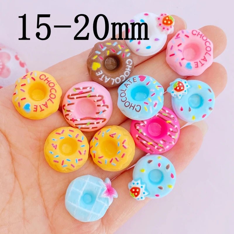 - Contenu : 20 cabochons en résine en forme de beignets (donuts).