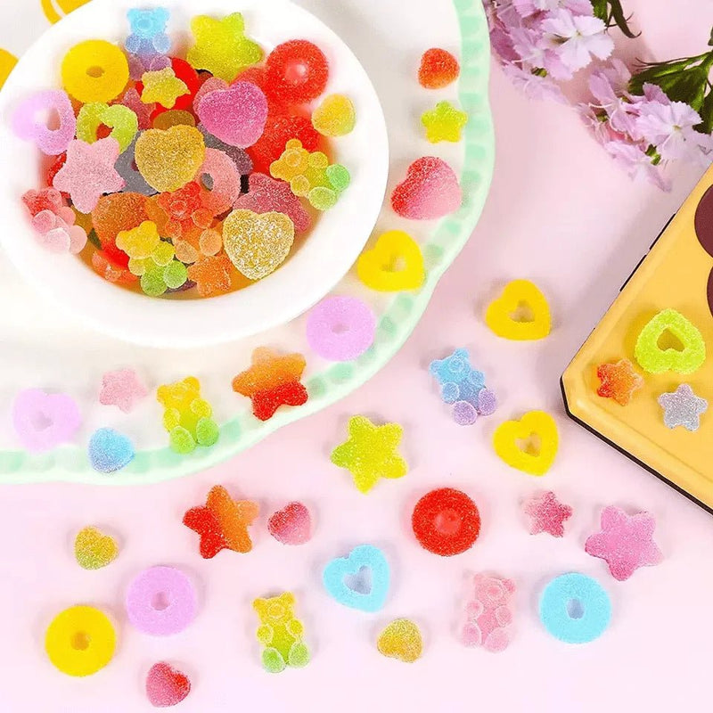 Libérez votre créativité avec ce lot de 50 charmes en forme de bonbons, réalisés dans une délicate résine gélifiée souple ! Ces adorables perles plates, aux couleurs vives et aux formes variées, sont l'accessoire parfait pour personnaliser une infinité de projets DIY avec une touche de douceur et de fun.