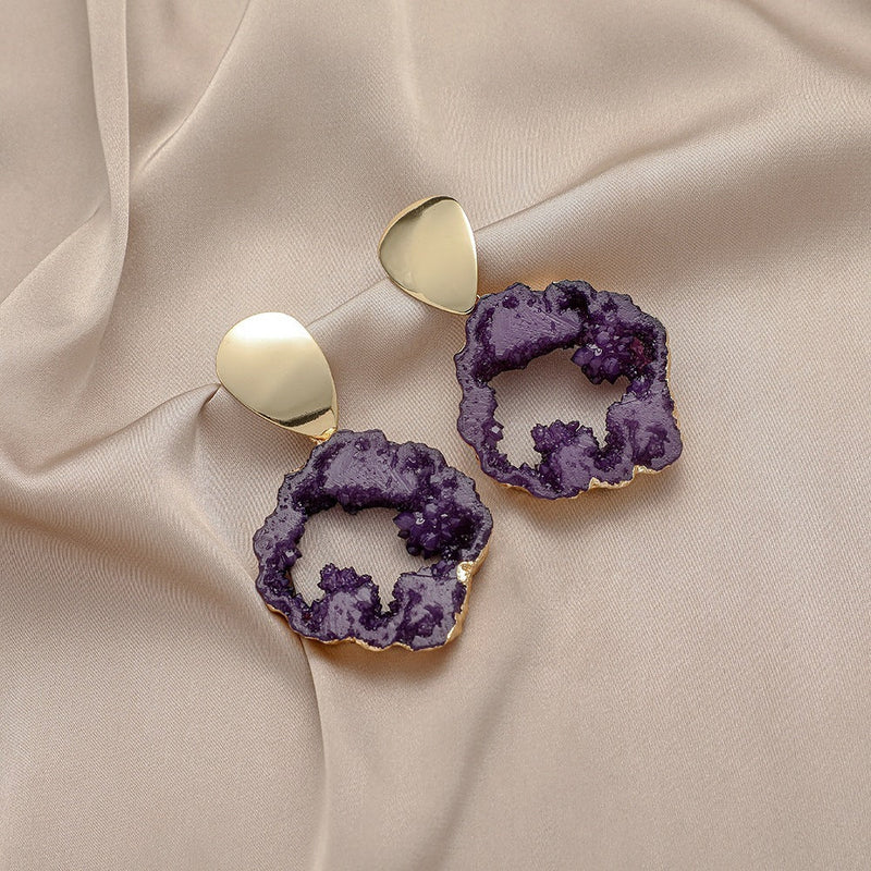 - Genuine Amethyst Stone: Each earring features a unique, irregularly shaped amethyst slice—no two are alike.